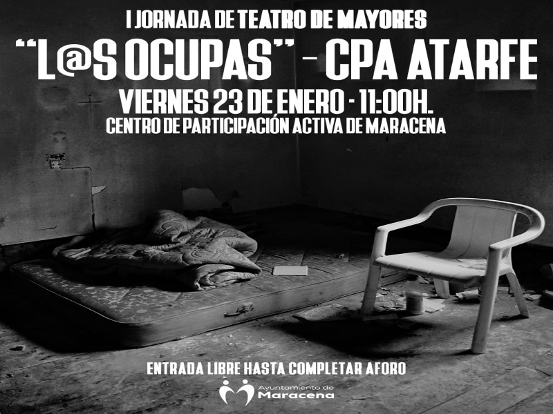 I JORNADAS DE TEATRO DE MAYORES DE MARACENA ¨L@s Ocupas¨ por el grupo de teatro del CPA de Atarfe Entrada Libre hasta completar aforo Viernes 23 de Enero 11.00 Hs. Centro de Participación Activa de