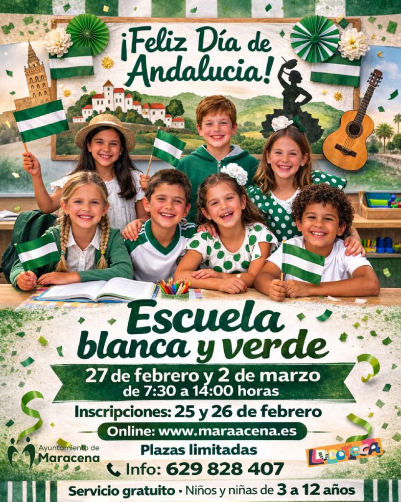 El Ayuntamiento de Maracena pone en marcha la Escuela Blanca y Verde, un servicio totalmente gratuito destinado a facilitar la conciliación familiar los días 27 de febrero y 2 de marzo, en horario de 7:30 a 14:00 horas, coincidiendo con los días festivos elegidos por la Comunidad Educativa.